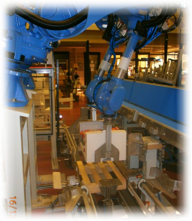 products are picked up and placed by two anthropomorphous robots into